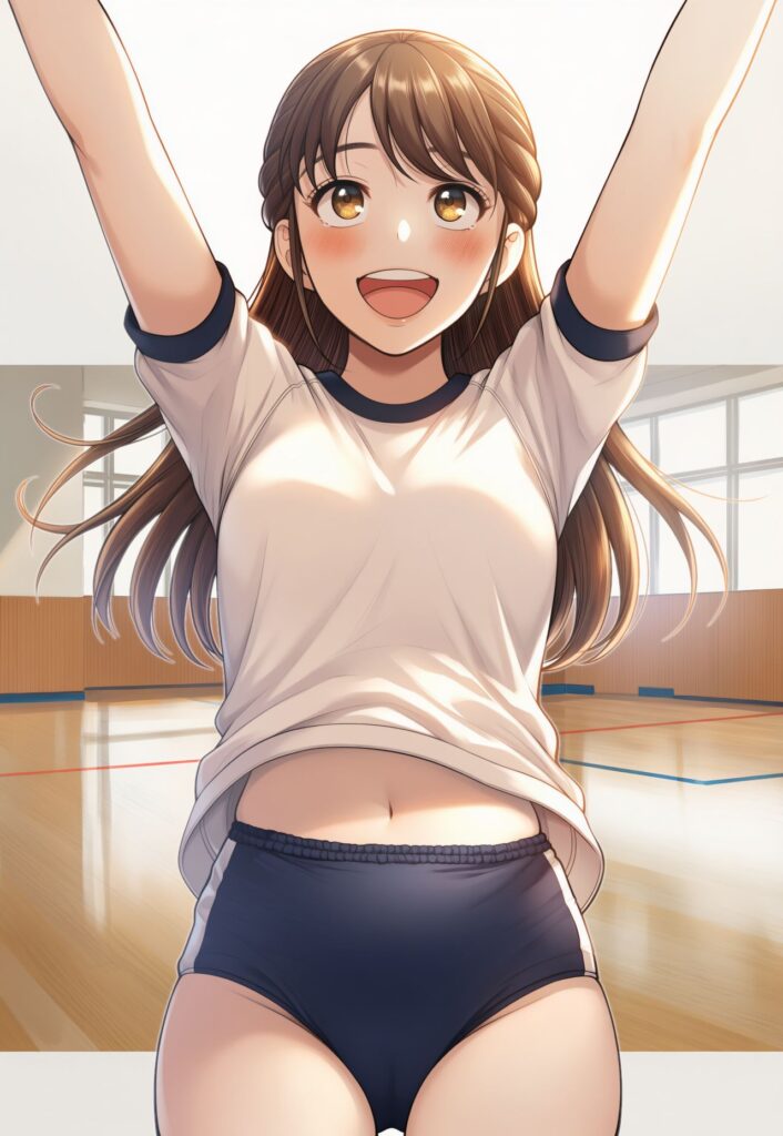 勢いで体操シャツがめくれて健康的なお腹が見えています。