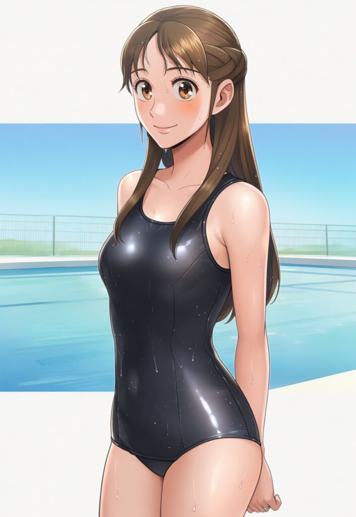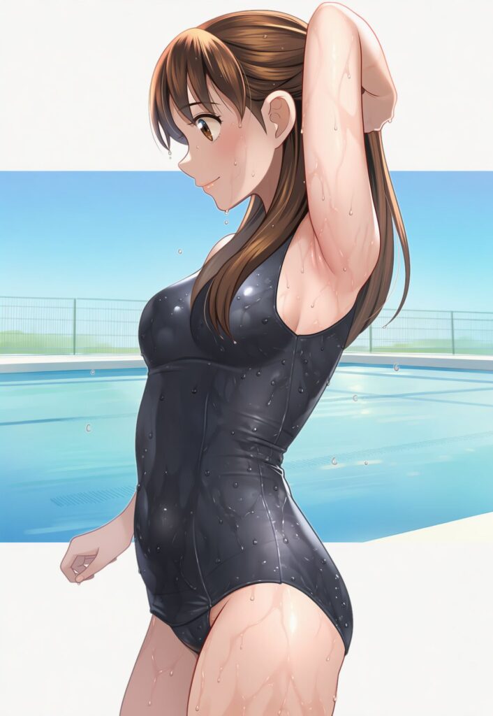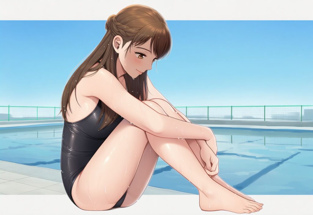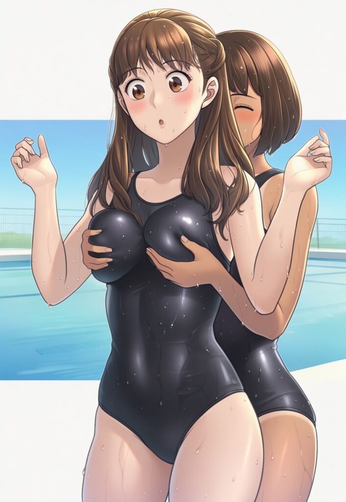 プールを挟んだ反対側では、男子の集団がワイワイやっていて、スクール水着姿の女子の採点をしています。