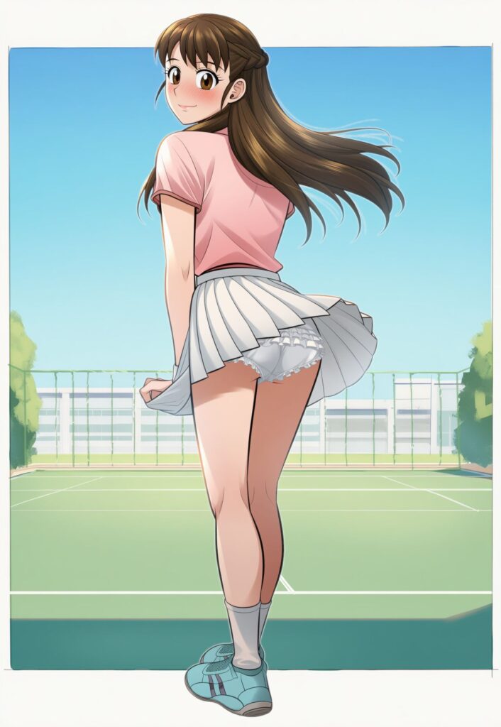 周りには、テニスルックの綾菜を一目見ようと、大勢の男子たちが集まっています。